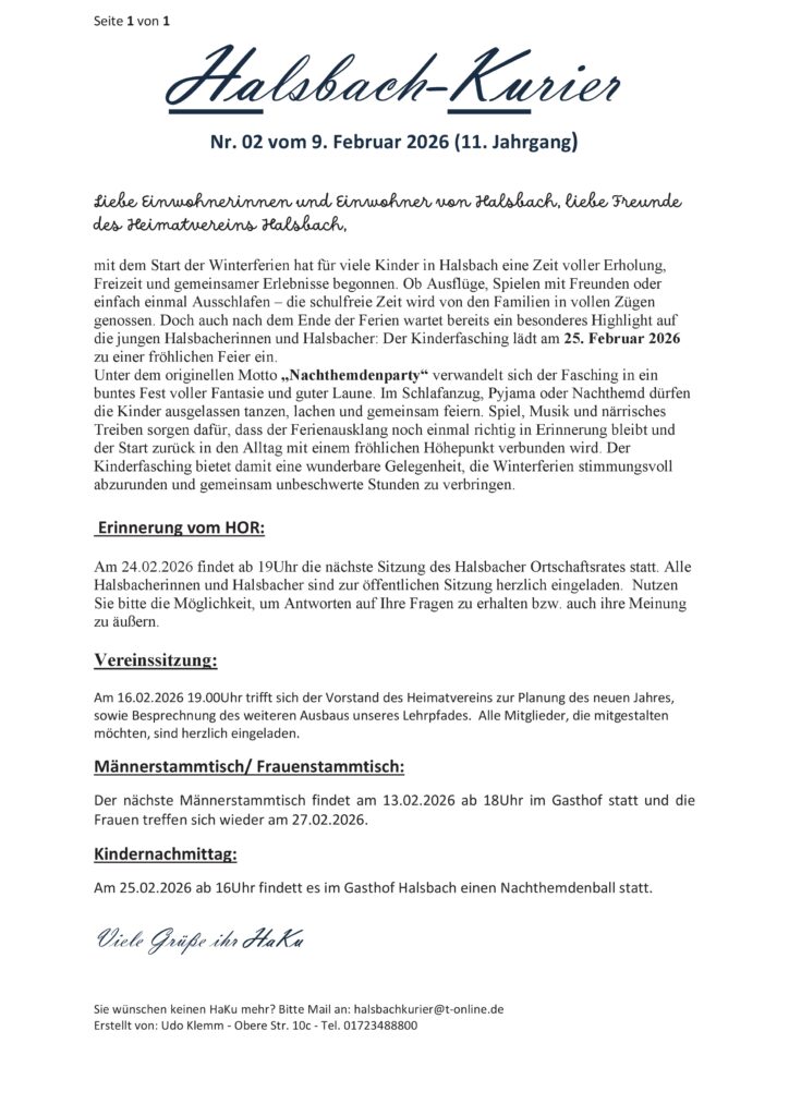 Hier findet Ihr jeweils die aktuellste Ausgabe des Halsbach Kuriers